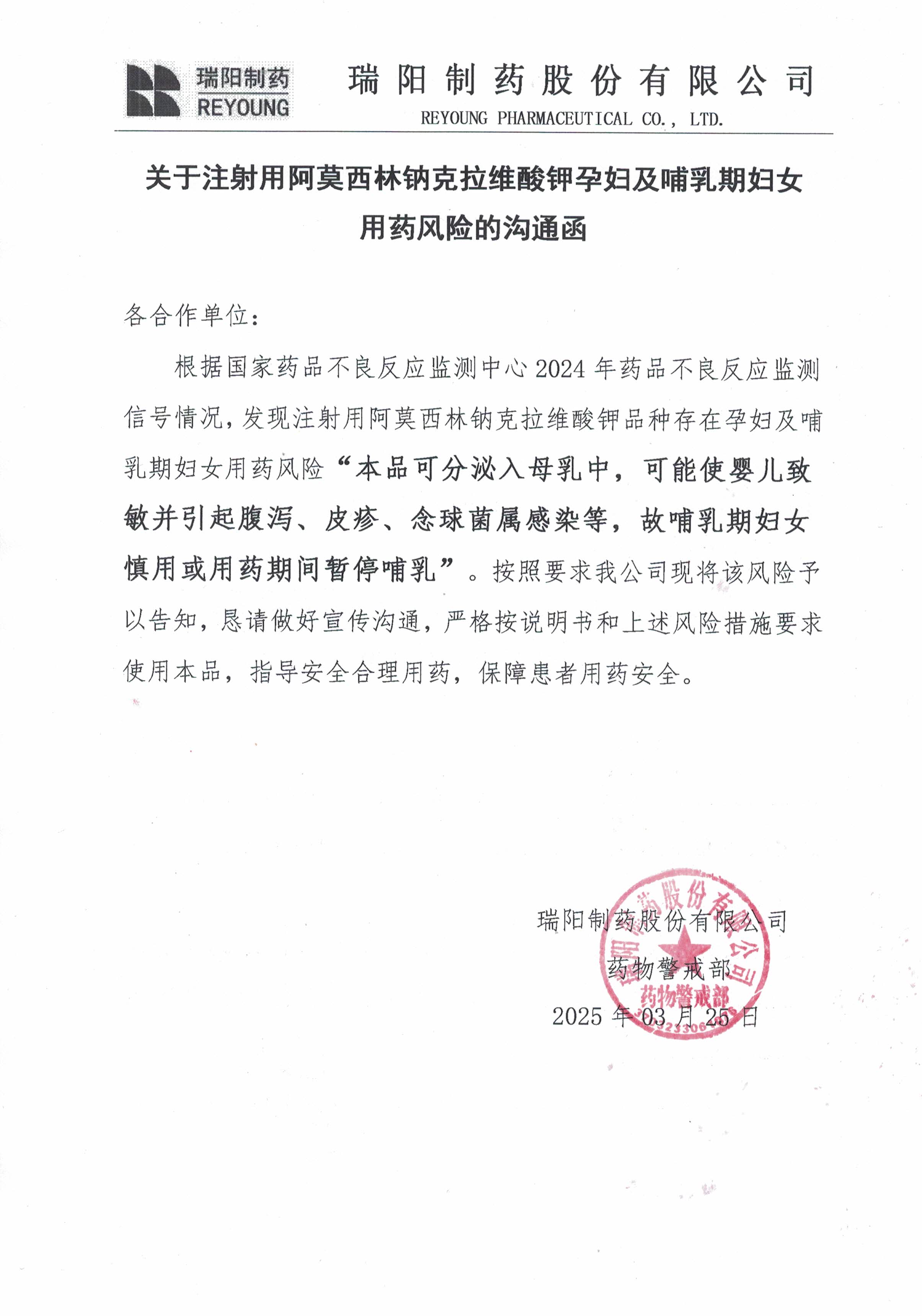关于注射用阿莫西林钠克拉维酸钾孕妇及哺乳期用药风险的沟通函
